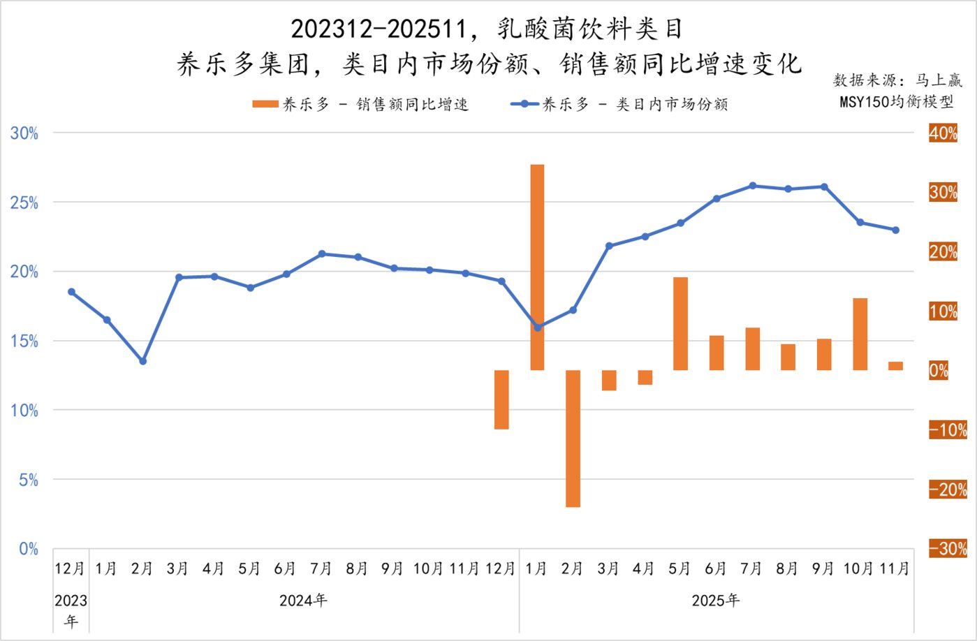 不错看到,2024/2025两年,养乐多在类目内的商场份额合座有较显耀的增长,大要5%傍边。从销售额同比增速来看,摒除2025年1、2月春节错位导致的较大波动外,养乐多从2025年5月起,销售额同比增速均为正,且部分月份格外10%,接近20%。
